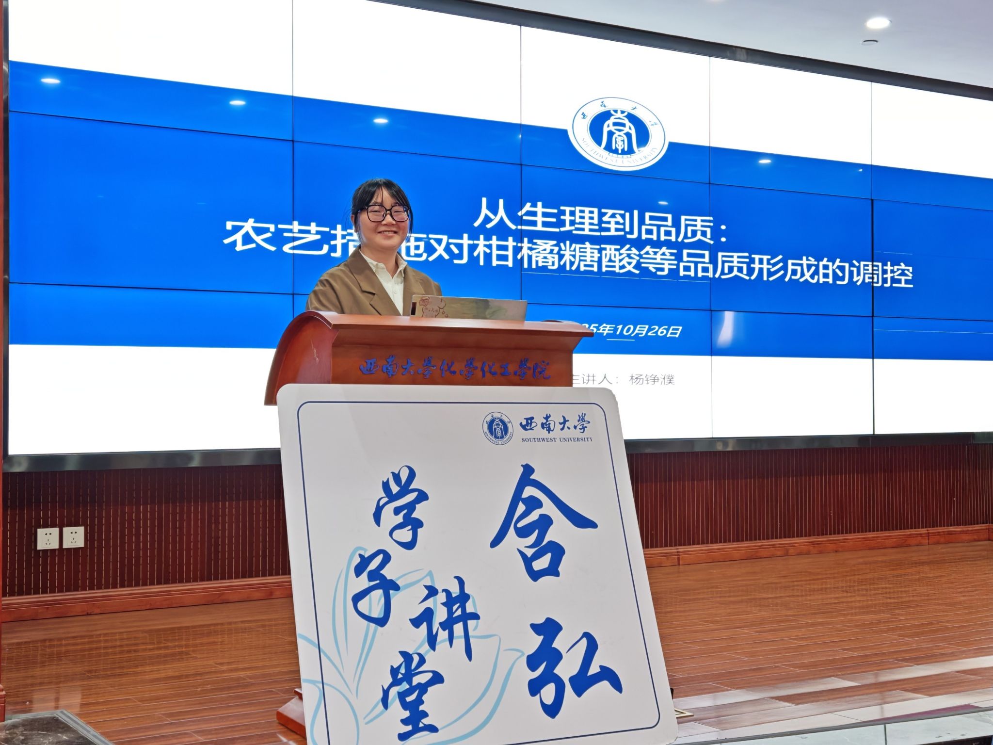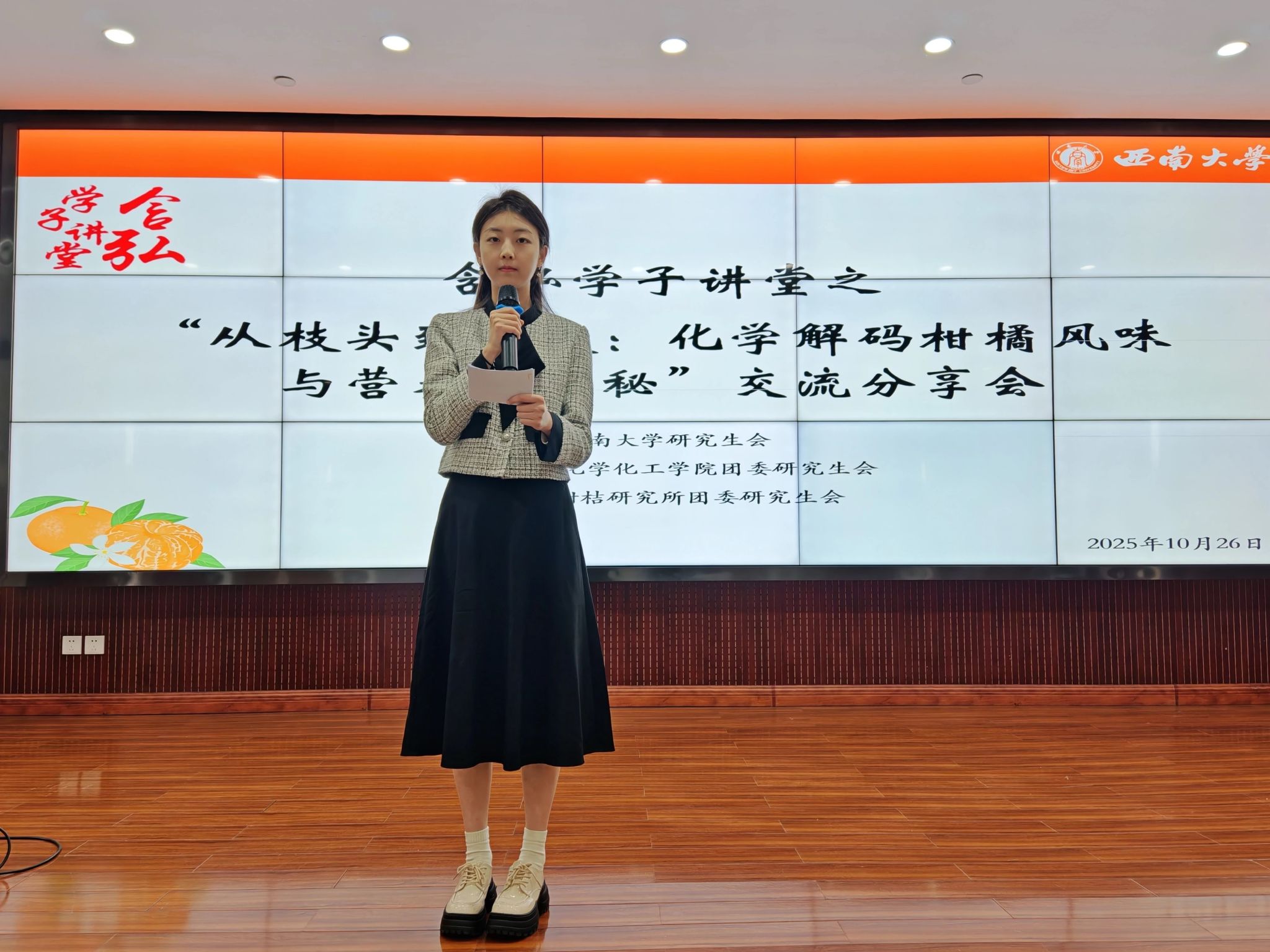 为促进学科交流、拓展研究视野,由best365英国体育在线研究生会主办,化学化工学院与柑桔研究所团委研究生会联合承办的含弘学子讲堂——“从枝头到舌尖:化学解码柑橘风味与营养的奥秘” 交流分享会,于2025年10月26日下午,在药化大楼B114教室圆满落幕。