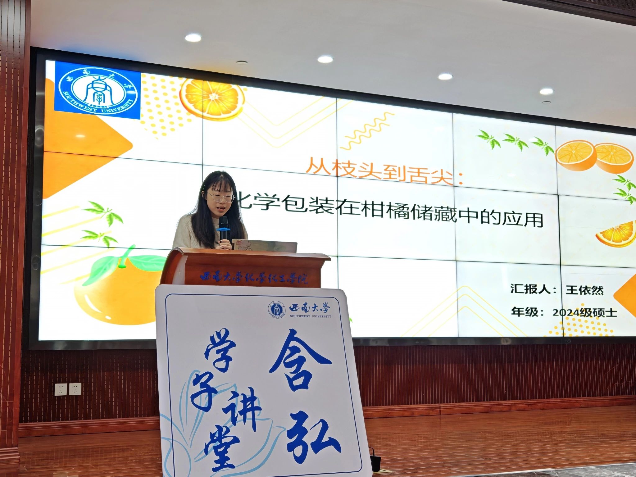化学化工学院2024级化学专业硕士研究生王依然聚焦于 “柑橘的风味和储存中的化学” 。她从采后保鲜的现实问题切入,展示了化学检测技术如何追踪风味变化,并重点分享了智能包装材料等创新技术如何为柑橘的“保鲜期”赋能。她的分享,让冰冷的化学公式跃然成为保障“舌尖安全与品质”的温暖守护。