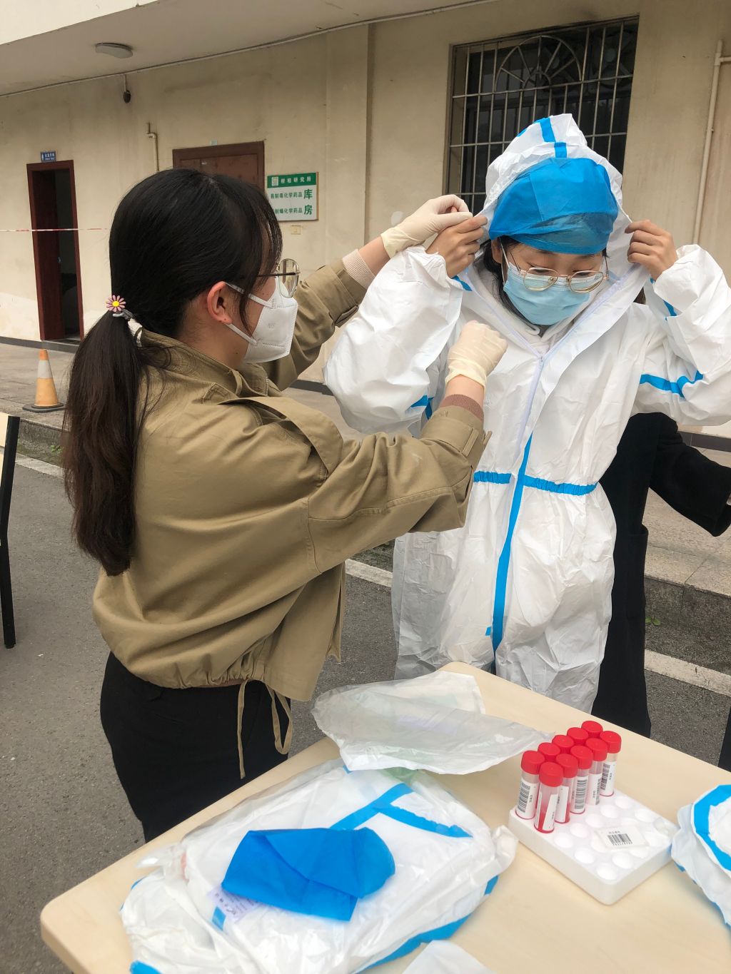 徐静仪在所内核酸采样点培训学生志愿者张瑞琪着防护服