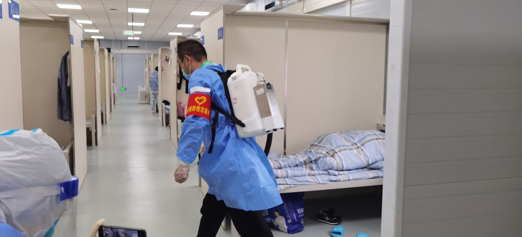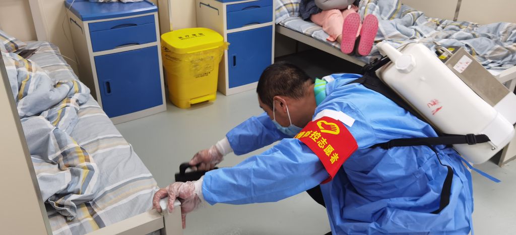 沈焱杰在重庆市医疗救治中心南彭院区帮忙开展消毒工作