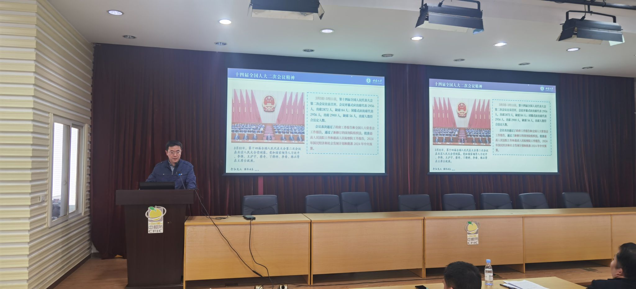所党委副书记、纪委书记刘昭暾传达了十四届全国人大二次会议精神和全国政协十四届二次会议精神。刘昭暾从大会概况、政府工作报告、国务院组织法、全国人民代表大会常务委员会工作报告、“两高”工作报告、全国政协常务委员会工作报告等方面,回顾了两会盛况,传达了两会精神。