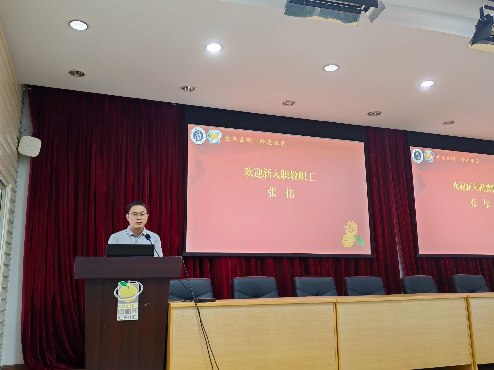大会最后,为新入职教职工张伟博士举行了入职仪式,张伟介绍了自己的求学经历,以及进入我所病虫害绿色防控中心团队的未来工作构想。全所教职工对张伟加入柑桔所大家庭表示热烈的欢迎,并送上了对青年一辈的期许与祝福。(沈焱杰 供图)