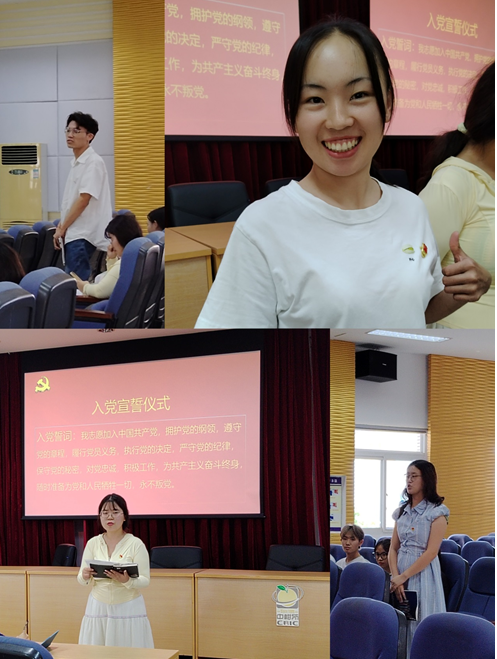 会上,为新发展的3位预备党员举行了入党宣誓仪式。宣誓仪式由党支部副书记李佳欣主持。常青华为新入党党员佩戴党徽,并赠送了书籍《中国共产党简史》。李佳欣宣布了参加宣誓的新党员名单。预备党员及其他党员佩戴党徽,举起右拳面对鲜红的党旗,庄严宣誓:“我志愿加入中国共产党,拥护党的纲领,遵守党的章程……”,铮铮誓言表达了大家对党的无限忠诚和为党的事业奋斗终身的坚定信念。新党员崔阳阳承诺,将牢记入党誓词,自觉学习党的理论知识,不断充实自己,提升敢于斗争的勇气,树立党员良好形象。王亚丽在发言中说,人生道路漫长,但自己将不忘初心,严格要求自己,向身边优秀党员学习,对专业孜孜以求,服务农业农村发展,争做有信仰有情怀有担当的时代新青年。杜德娥表示,要时刻牢记党员身份,在学习生活实践中不断磨练自己,用实际行动发挥党员先锋模范作用,并树立起终身学习的观念,在专业领域不断深耕。常青华强调入党宣誓仪式是人生重要的里程碑,全体党员要将始终铭记入党誓词,始终保持对党的赤胆忠诚、对人民的赤子之心,发挥党员模范带头作用,将智慧和青春融入到党的事业中,用过硬作风彰显党员的光辉形象。