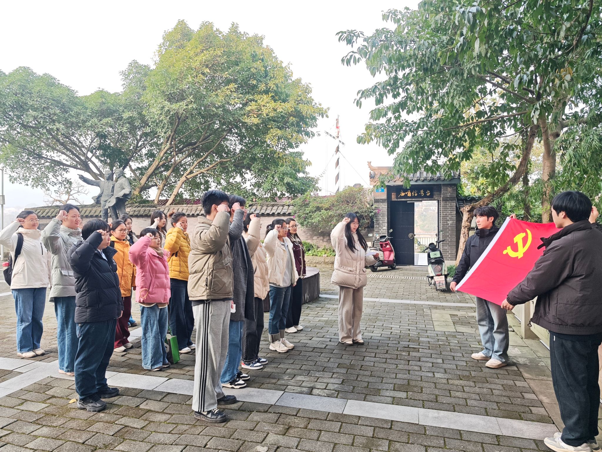 参观结束后,面对党旗,举行了神圣而隆重的入党宣誓仪式。面向鲜红的党旗,新发展预备党员高举右拳,用铿锵有力的誓言,许下了对党的忠诚承诺,表达了为共产主义事业奋斗终身的坚定决心。其他党员也一同重温了入党誓词,再次接受了思想的洗礼和党性的淬炼。宣誓仪式结束后,全体人员在纪念馆前合影留念,定格下这具有纪念意义的时刻。