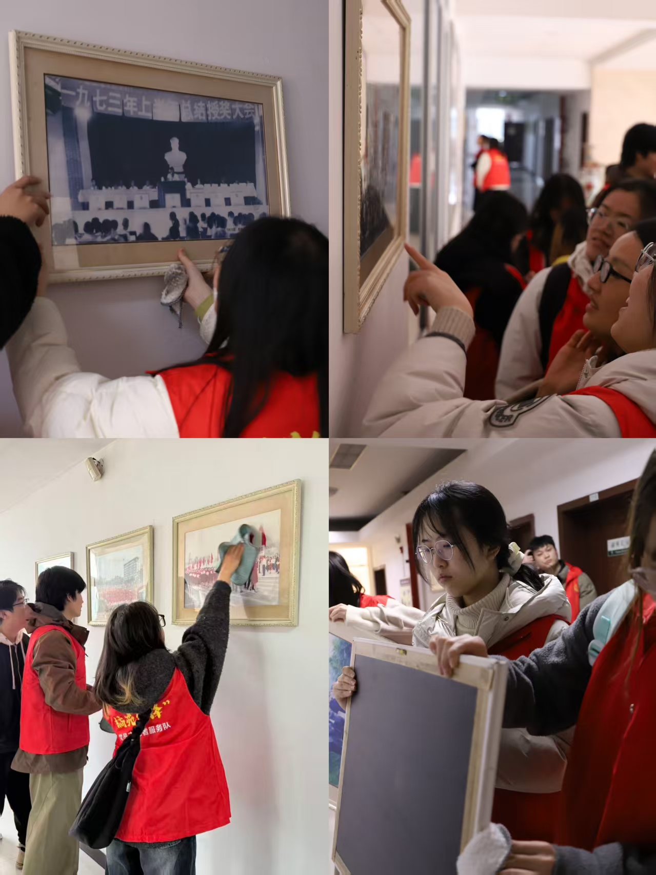 在综合大楼二楼走廊,全体党员开展清洁文化墙照片的志愿服务活动,小心擦拭墙上的老照片,拂去岁月的尘埃。两个党支部书记常青华、陶镜宇为党员讲述了老照片背后的奋斗故事。党员们表示“每一张老照片都是一段珍贵的历史记忆,擦拭的不仅是灰尘,更是对先辈奋斗历程的敬畏与缅怀”。从泛黄的影像里探寻建所初期的艰辛历程,回味一代代柑桔人攻坚克难的发展足迹,全体党员更直观地感受到了柑桔所发展的不易,也更加坚定了传承先辈精神、接续奋斗的决心。