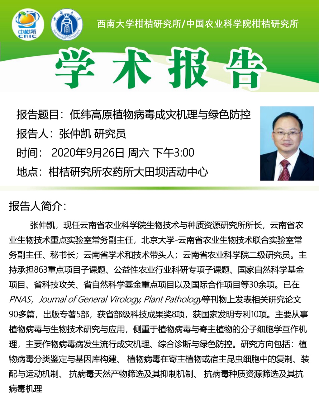 云南省农科院生物技术与种质资源研究所所长张仲凯研究员9月26日下午3:00在农药所活动中心分享学术报告《低纬高原植物病毒成灾机理与绿色防控》。