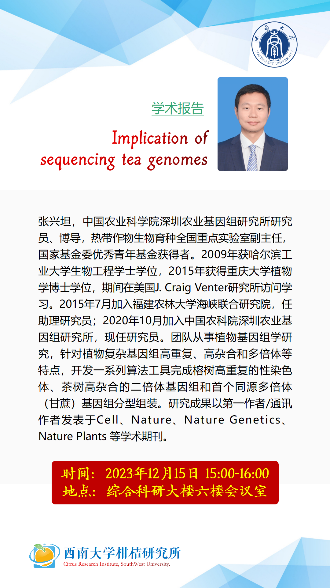 12月14日下午15:00-16:00,中国农业科学院深圳农业基因组研究所研究员、博导张兴坦博士将来我所为大家分享题为“Implication of  sequencing tea genomes”的学术报告,欢迎各位师生抽时间参加学习和交流。