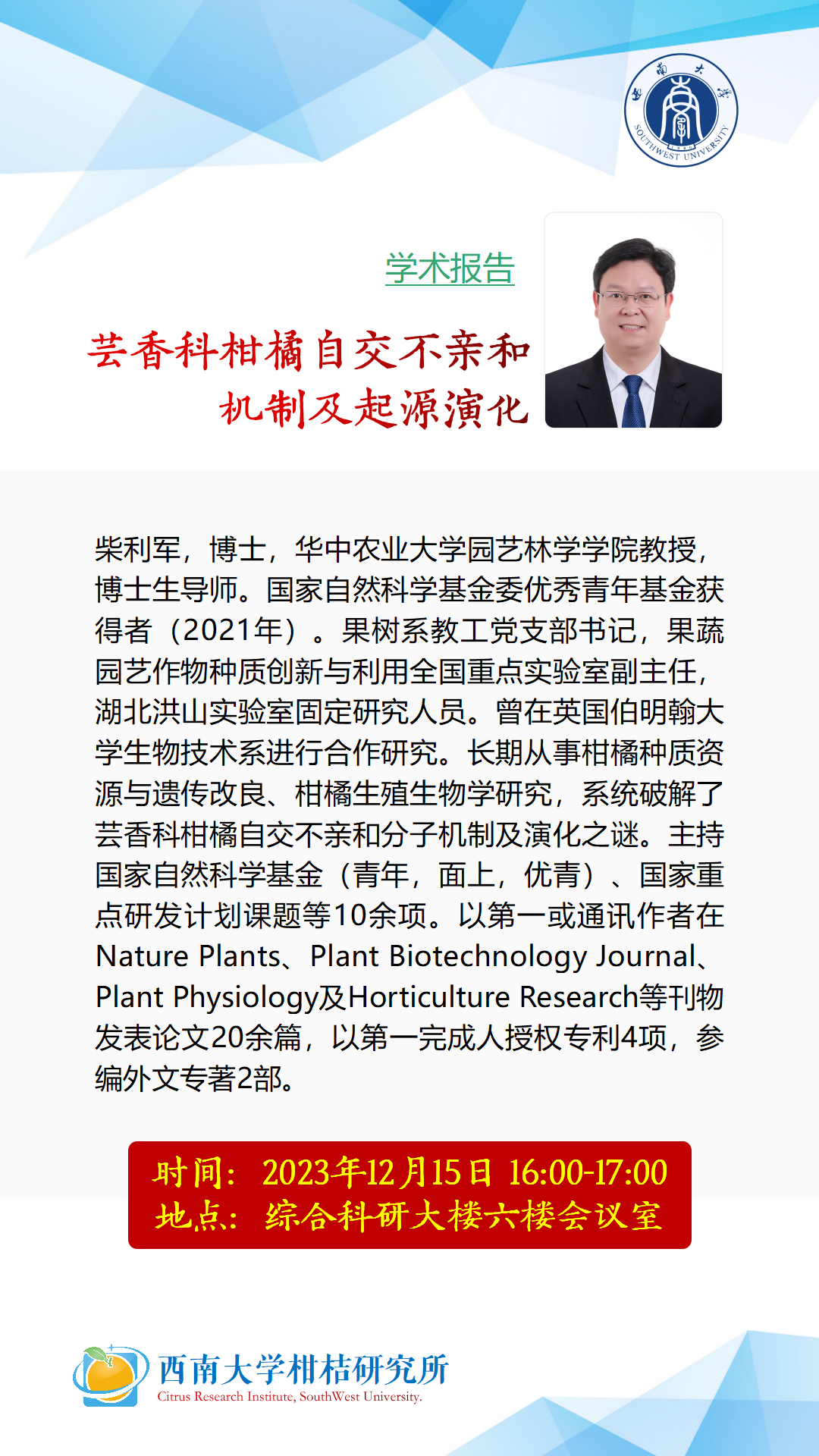 12月14日下午16:00-17:00,华中农业大学园艺林学学院教授、博导柴利军博士将来我所为大家分享题为“芸香科柑橘自交不亲和机制及起源演化”的学术报告,欢迎各位师生抽时间参加学习和交流。