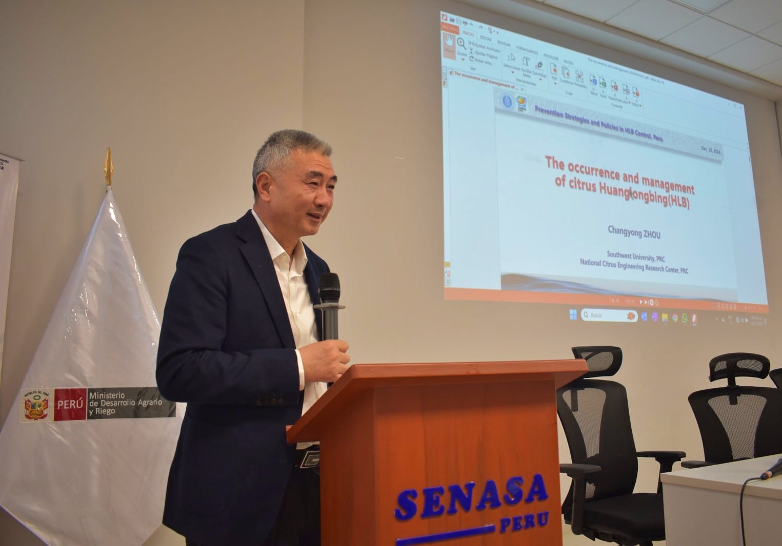 12月10日,周常勇研究员在秘鲁利马市参加柑桔黄龙病专题讲座会。该会议邀请了两位专家进行讲座,采用西班牙语与英语同声翻译方式,来自秘鲁柑橘生产者协会(ProCitrus)、秘鲁植物检疫局(SENASA)官员和技术人员、大学教授、柑桔业主等50多人参会。周常勇研究员在会上进行了“柑桔黄龙病发生与治理”主题讲座,介绍世界五大洲柑桔黄龙病HLB发生概况和防控现状,重点介绍了中国防控经验和两个中国重点研发项目的最新研究进展,并针对秘鲁情况提出了防控建议。