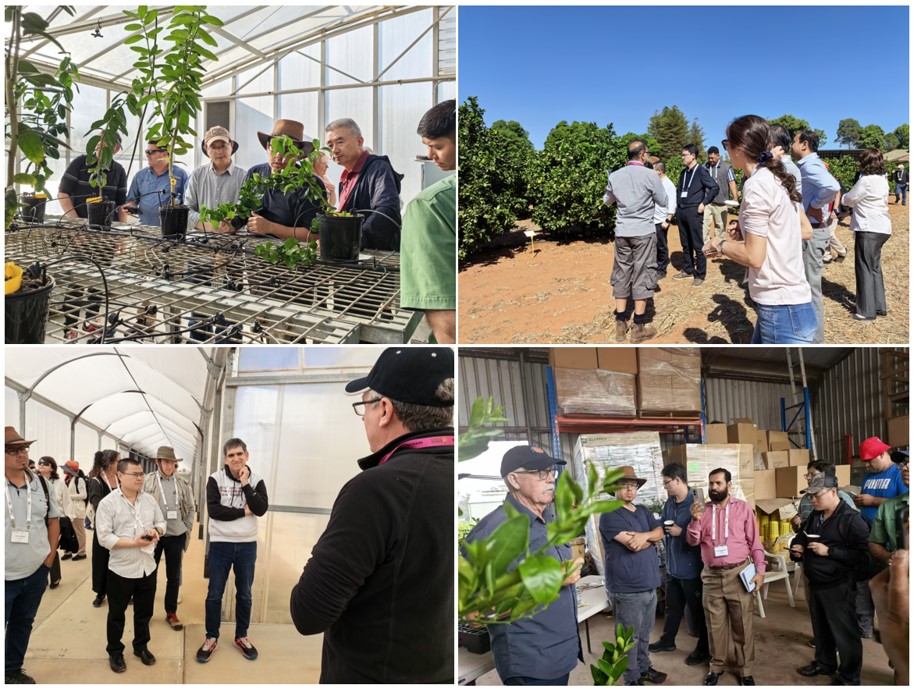 在会议考察期间,中心代表团前往了新南威尔士州原初产业部的德尔顿(Dareton)柑橘试验站的品种观察园、砧木比较试验园和类病毒矮化试验圃,以及澳大利亚柑橘无病毒繁育计划(Auscitrus)保种和育苗温网室设施进行实地考察,详细了解了当地在柑橘种植管理、育苗繁殖及产业链构建等方面的先进经验。代表团还参观了新南威尔士州Eyles Citrus柑橘育苗圃,并深入考察了伊丽莎白麦克阿瑟农业研究所(EMAI),现场聆听专家讲解先进检测技术及数据处理流程。