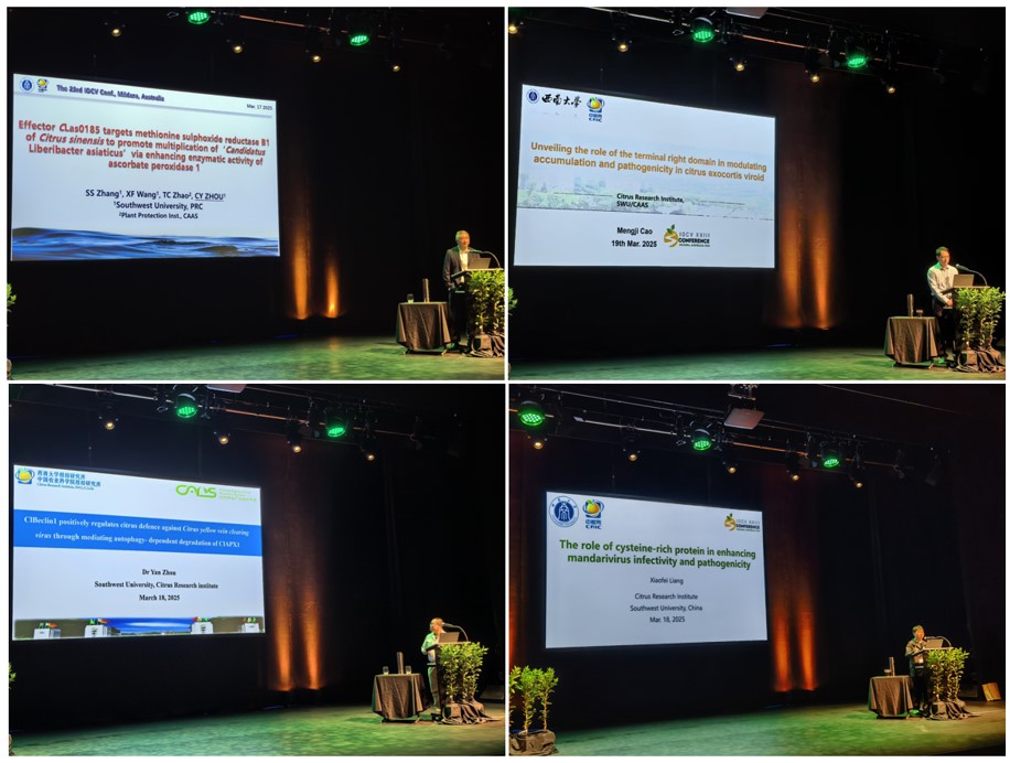会议期间,周常勇研究员及曹孟籍研究员分别主持了“传毒介体与闭幕式”和“黄龙病及其他细菌病害”两个大会议题,周常勇研究员、曹孟籍研究员、周彦研究员及梁晓飞分别作了会议报告,展示了我国在柑橘病毒及黄龙病研究领域的最新成果与前沿进展,研究成果获国际同行广泛关注与认可。与会学者不仅分享了各自国家在柑橘病害检测与防控方面的成功经验,同时也就如何加强跨学科合作、利用高通量测序及人工智能辅助技术等新手段展开激烈讨论。此次国际会议为我国科研团队在病毒学研究中引入先进设备和理念提供了新的思路和方法,也为未来在国际舞台上开展多领域合作奠定了基础。