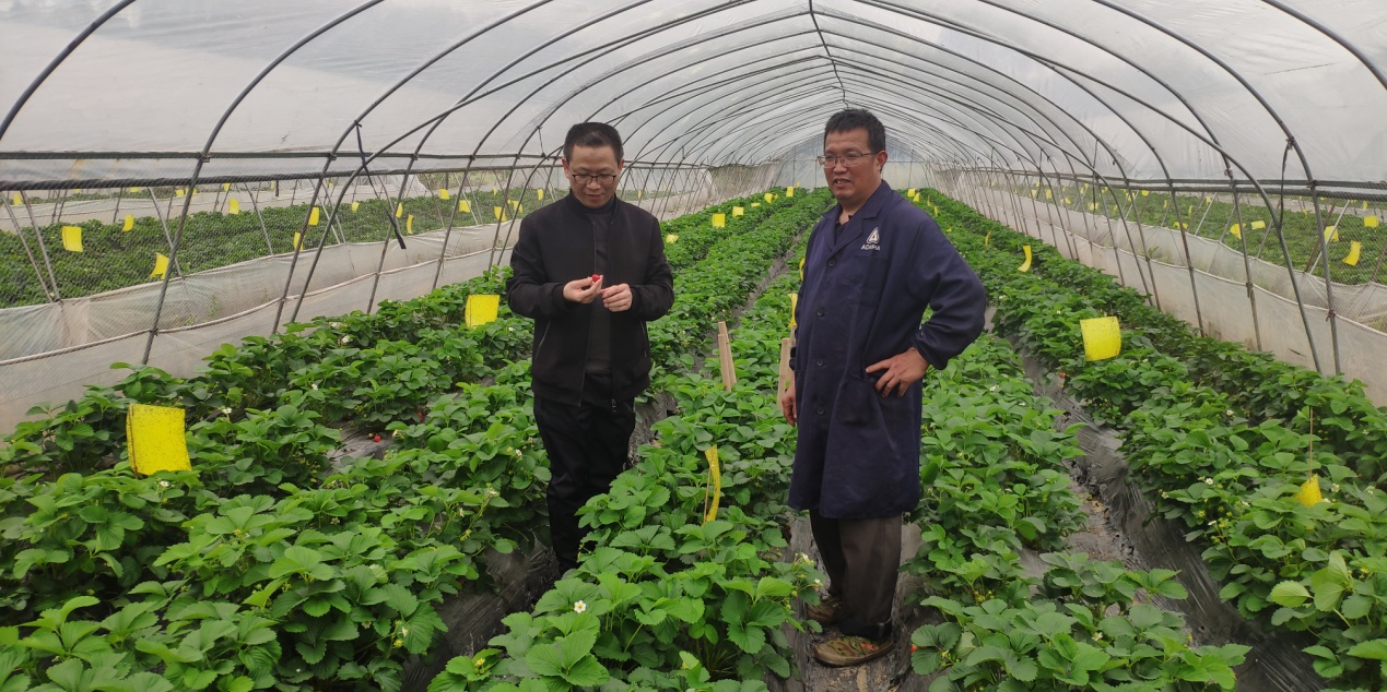 王树良副研究员实地察看了草莓生长情况,强调草莓是直接鲜食水果,要达到无公害绿色农产品标准,必须慎重选择有效农药防治。据农场主介绍,他主栽草莓和水果番茄,面积有近30亩,草莓病害严重,防治是生产上的一大难题。