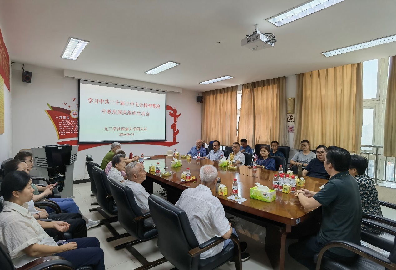 2024年9月13日,在丹桂飘香、中秋佳节来临之际,九三学社best365英国体育在线四支社在所三会议室召开了以“学习贯彻中共二十届三中全会精神”为主题的组织生活会,胡军华主委主持会议,所党委书记谭志友应邀莅临指导。