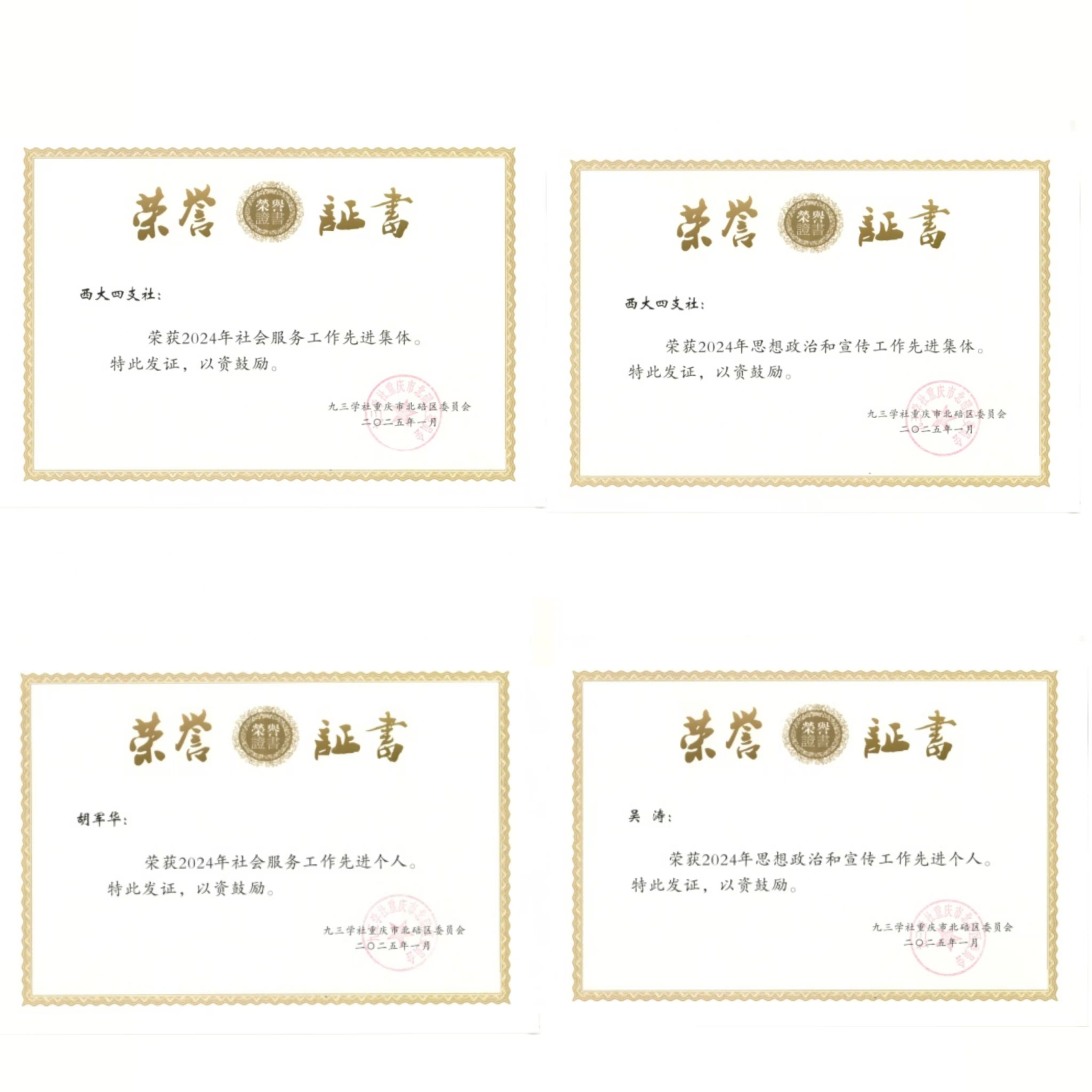 在九三学社北碚区委员会表彰中,四支社获“思想政治和宣传工作先进集体”、“社会服务工作先进集体”两项荣誉,社员胡军华和淳长品获“社会服务工作先进个人”,吴涛和董朝菊获“思想政治和宣传工作先进个人”,“董朝菊和李鸿筠获社情民意工作先进个人”,崔永亮获“组织建设工作先进个人”。